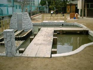 この観察池は、2002年の4月から水草やメダカを放します。放すまでは水を慣らすため、水を張っています。